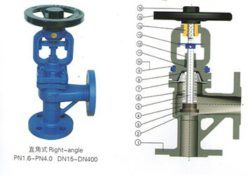 1.直角式截止閥的啟閉件是塞形的閥瓣,密封面呈平面,閥瓣沿流體的中心線作直線運(yùn)動(dòng),介質(zhì)流向?yàn)?5°(低進(jìn)高出)
